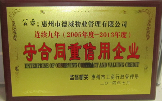 2014年,惠州市德威物业管理有限公司2005-2013年连续九年荣获“守合同重信用企业”荣誉称号