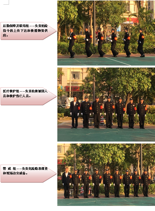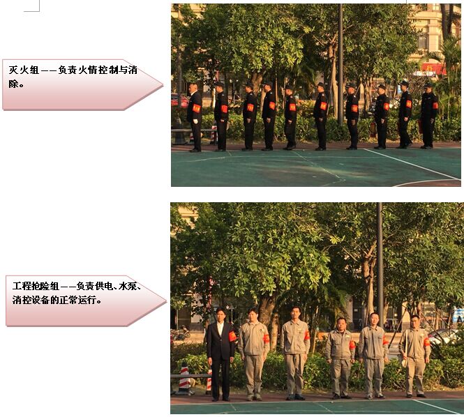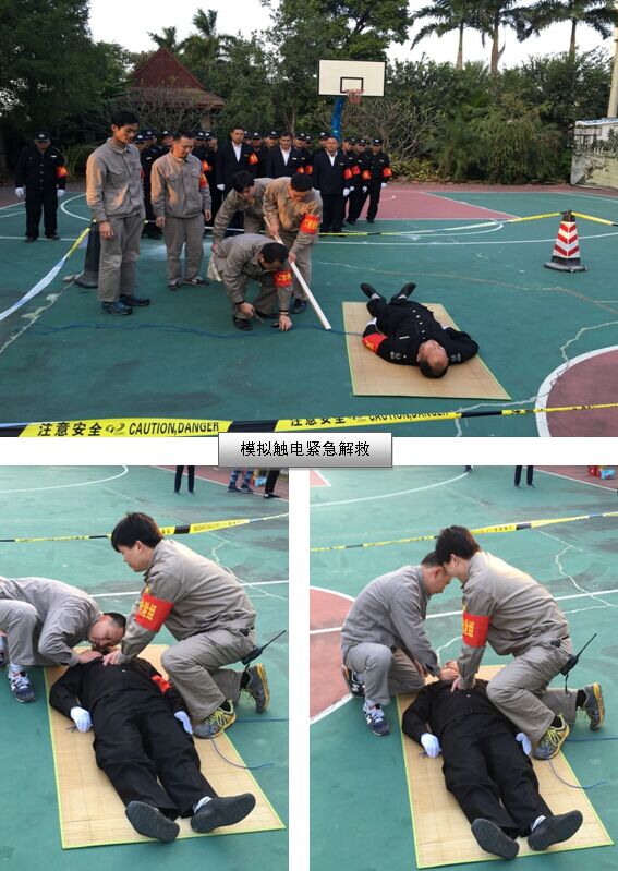 整个演习训练分四大项目进行:知识抢答—技能比拼—消防演练—突发应急预案演习训练。