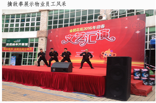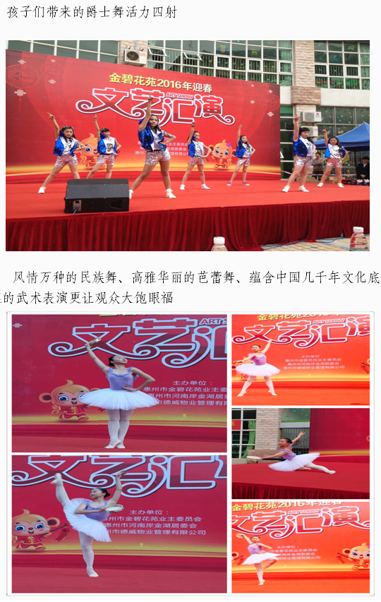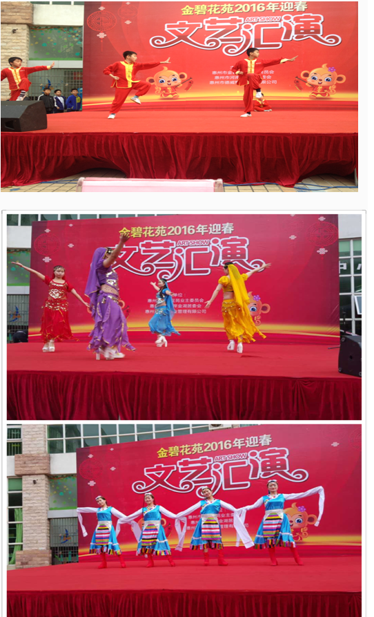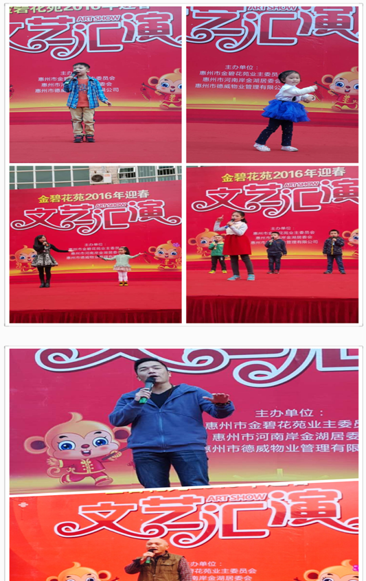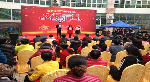 为了不断丰富小区业主的文化生活,同时充分展示金碧花苑小区精神文明创建的成果,1月9日,德威物业金碧花苑管理处、金碧花苑业主委员会联合河南岸街道金湖居委会举办了“金碧花苑2016年迎春文艺汇演”,为小区业主送上了一顿丰盛的文化大餐。