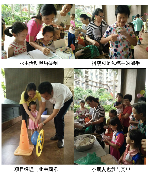 现场分为包粽子区及活动游乐区,小朋友可以在家长的陪同下一起玩丢沙包、无敌风火轮等趣味游戏,还可以在现场师傅的教导下学习包粽子。物业工作人员与业主一起互动,沟通业户感情,活动气氛持续高涨,直到晚上19:00才结束。