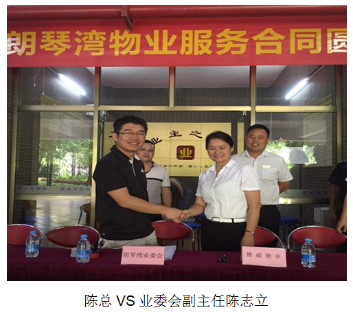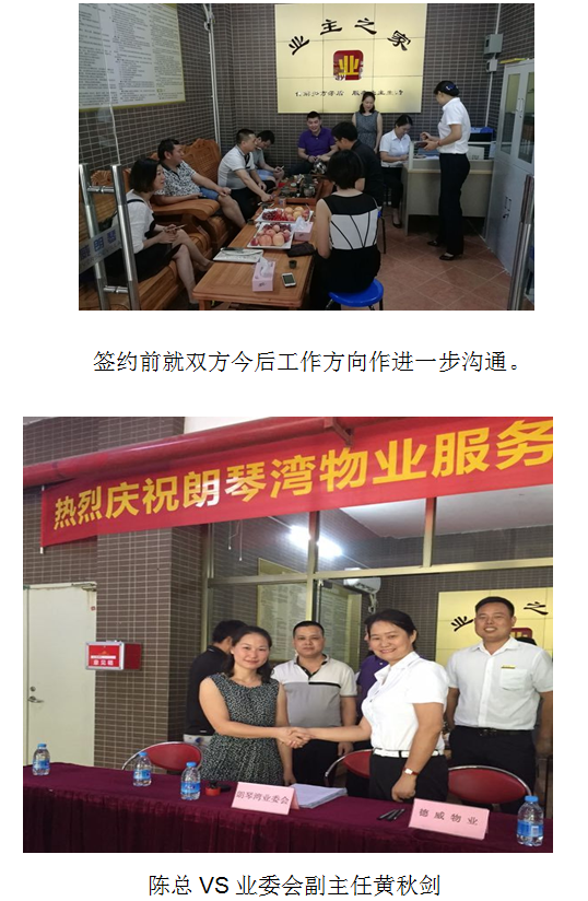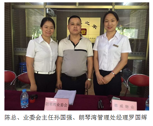 2017年5月28日上午11时,朗琴湾物业服务合同签约仪式在朗琴湾业委会办公室隆重举行。出席仪式的有朗琴湾业主委员会孙国强主任、陈志立副主任、黄秋剑副主任等7名业主委员会成员,物业公司陈晓红总经理、罗国辉经理、张俊梅主任等13名德威物业工作人员。