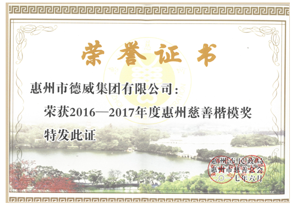 经社会各界推荐,市民政局、市慈善总会认定,我司荣获2016-2017年度惠州慈善楷模奖。
