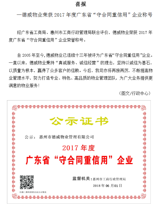 德威物业荣获2017年度广东省“守合同重信用”称号